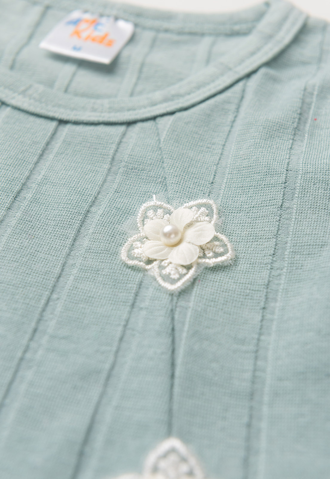 O vestido em tecido canelado apresenta detalhes de flores bordadas com aplicação em pérola que o tornam verdadeiramente especial. O babado cintura acrescenta um charme adicional.